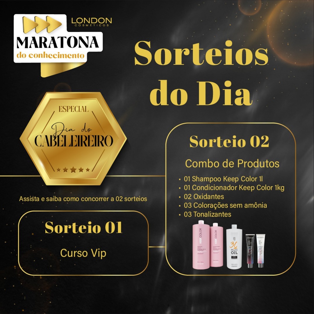 Além de muito conhecimento, a Maratona do Conhecimento, que comemora o Dia do Cabeleireiro, terá prêmios incríveis que serão sorteados em cada um dos dias e mais um super prêmio de R$2.000,00 (dois mil reais) em produtos da London Cosméticos que será sorteado no dia 19/01, Dia do Cabeleireiro.